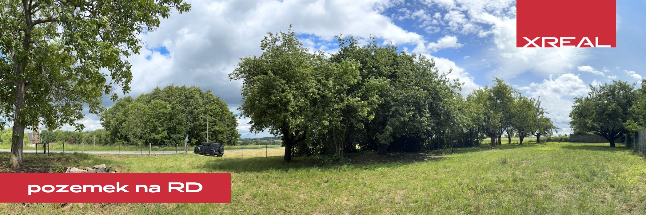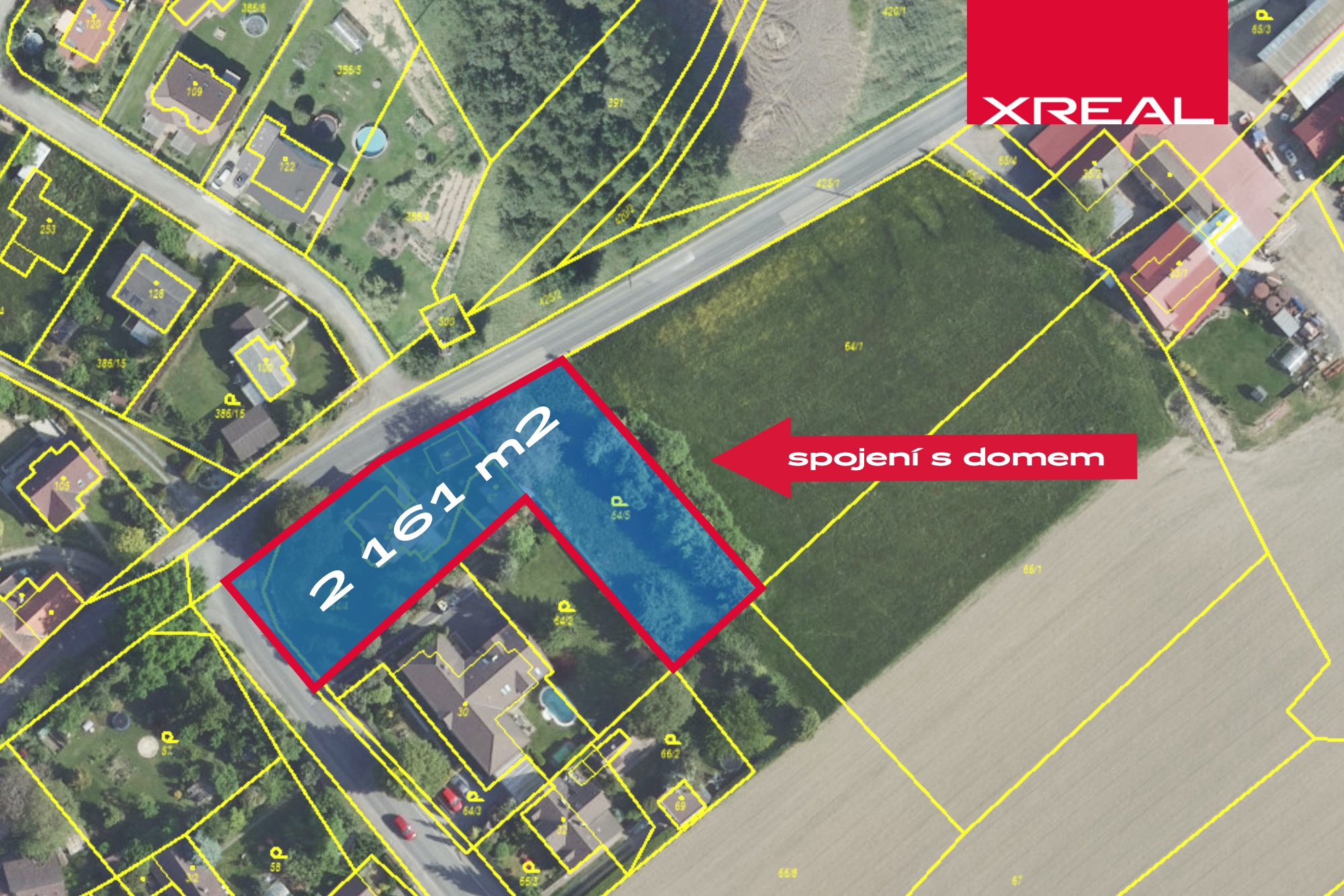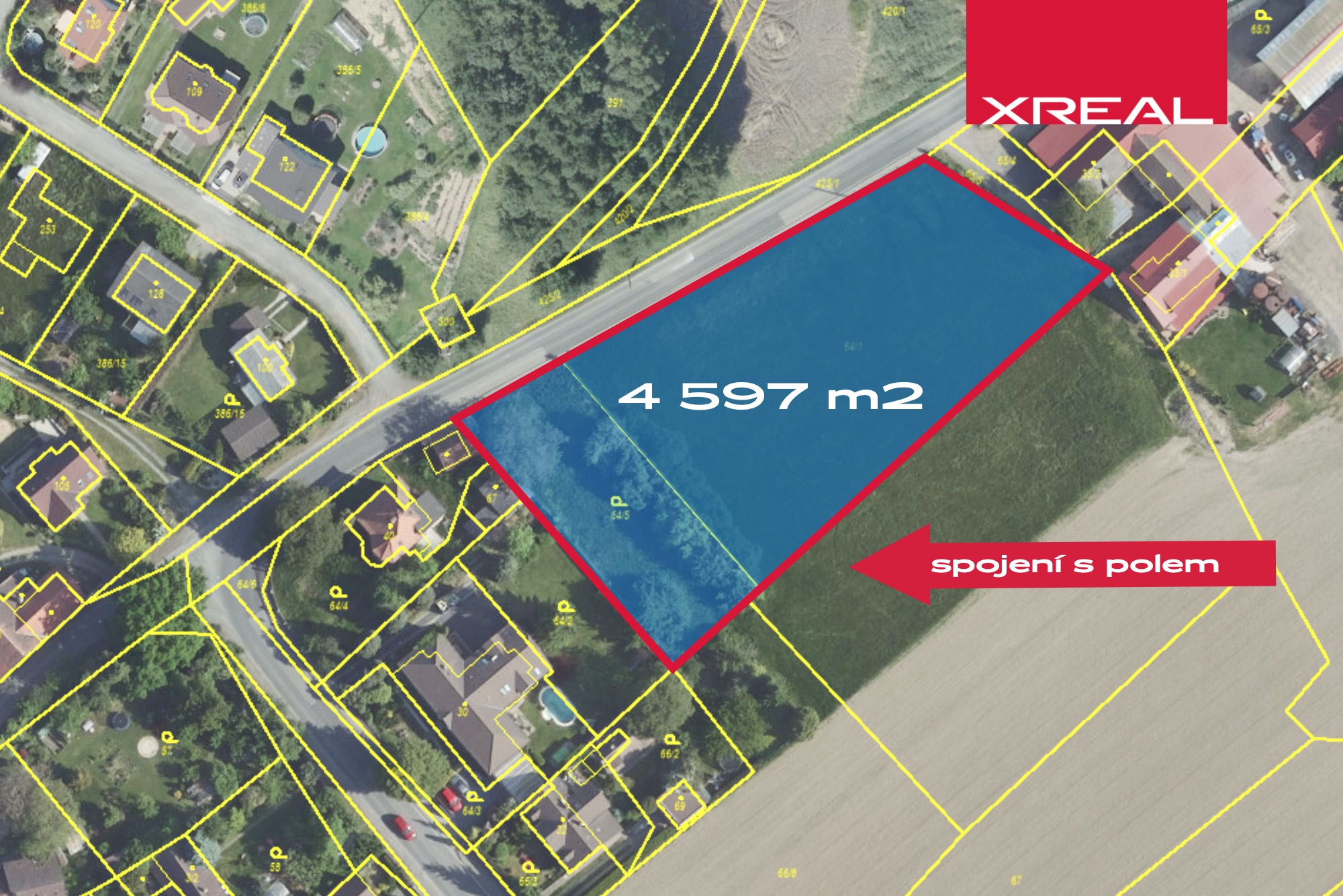 • ANEBO přikoupit sousední pozemek vpravo o výměře 3 482 m2, zatím pole v obci s potenciálem změny územního plánu, pak by celková výměra pozemků byla 4 597 m2.